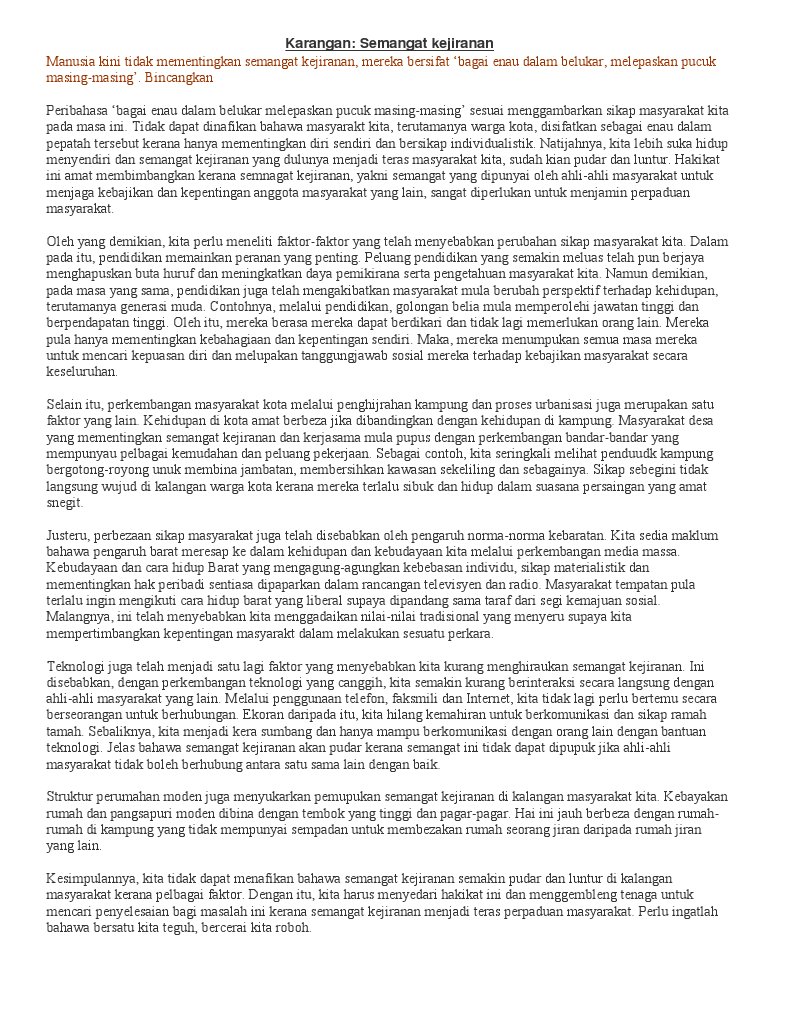 Sebagai contoh mengibarkan jalur gemilang mengadakan. Contoh karangan spm semangat kejiranan dalam kalangan rakyat di egara ini semakin longgar. Semangat kejiranan merupakan salah satu elemen penting dan vital yang membantu melahirkan anggota masyarakat yang harmoni mempunyai jati diri dan semangat cinta akan negara.